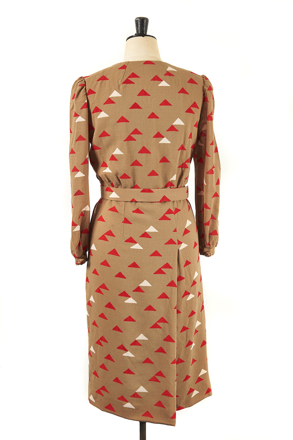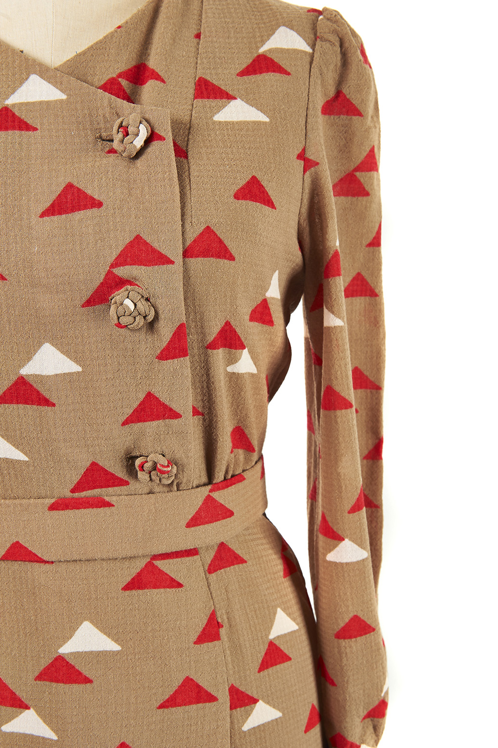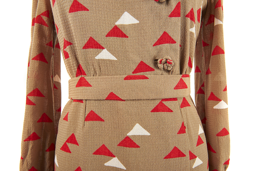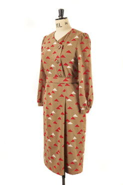 An original vintage dress with long sleeves and a red and white triangle motif throughout.