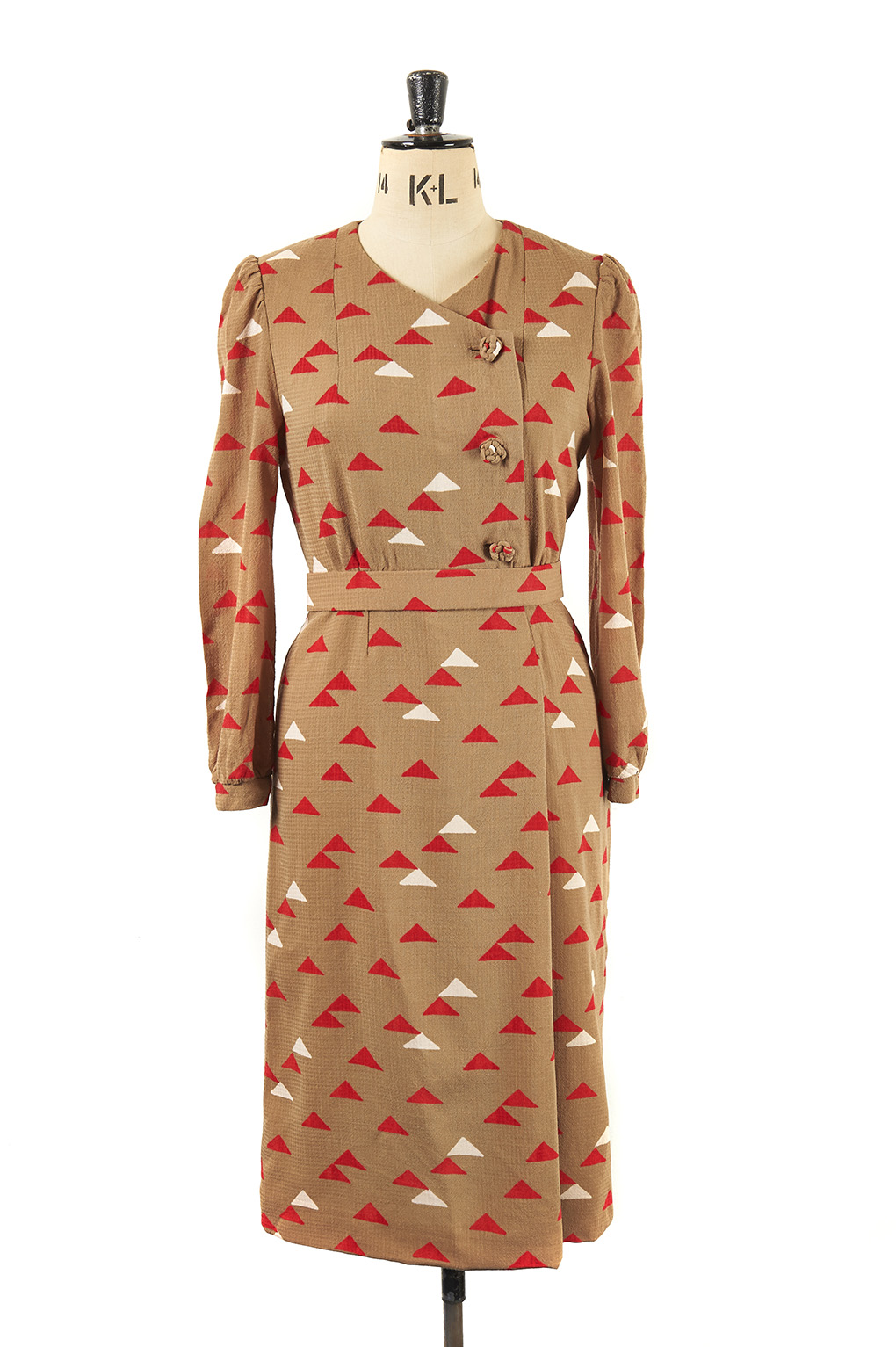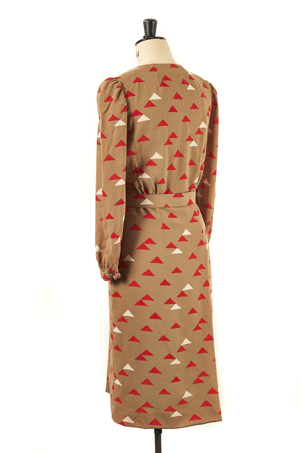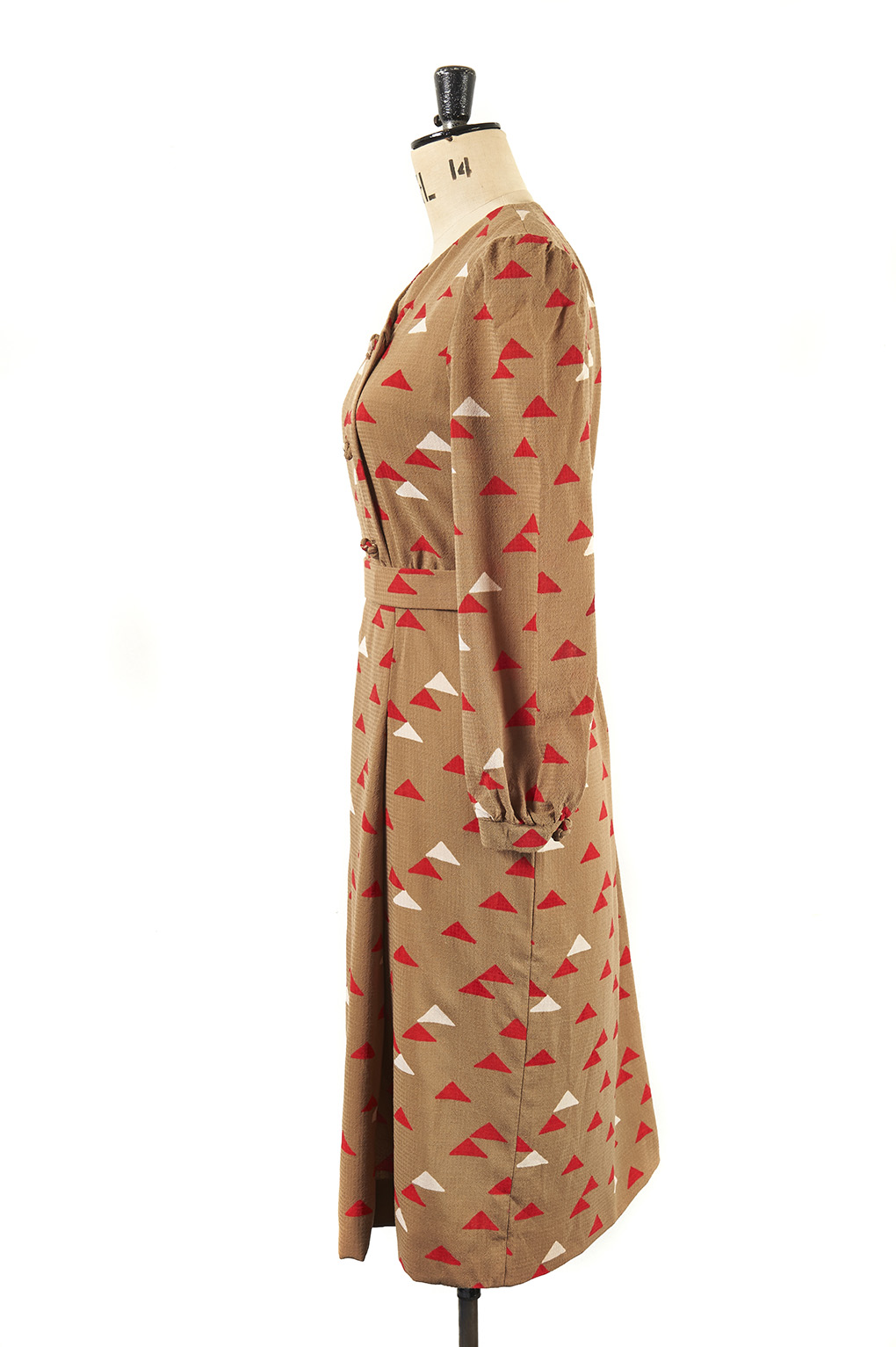 An original vintage dress with long sleeves and a red and white triangle motif throughout.