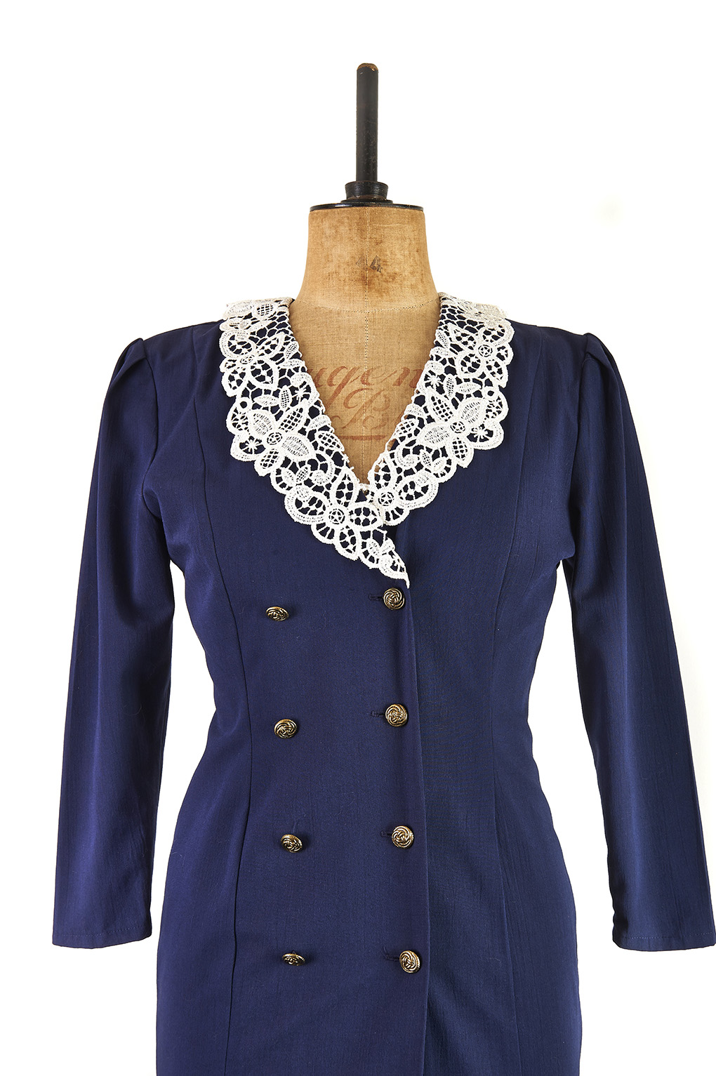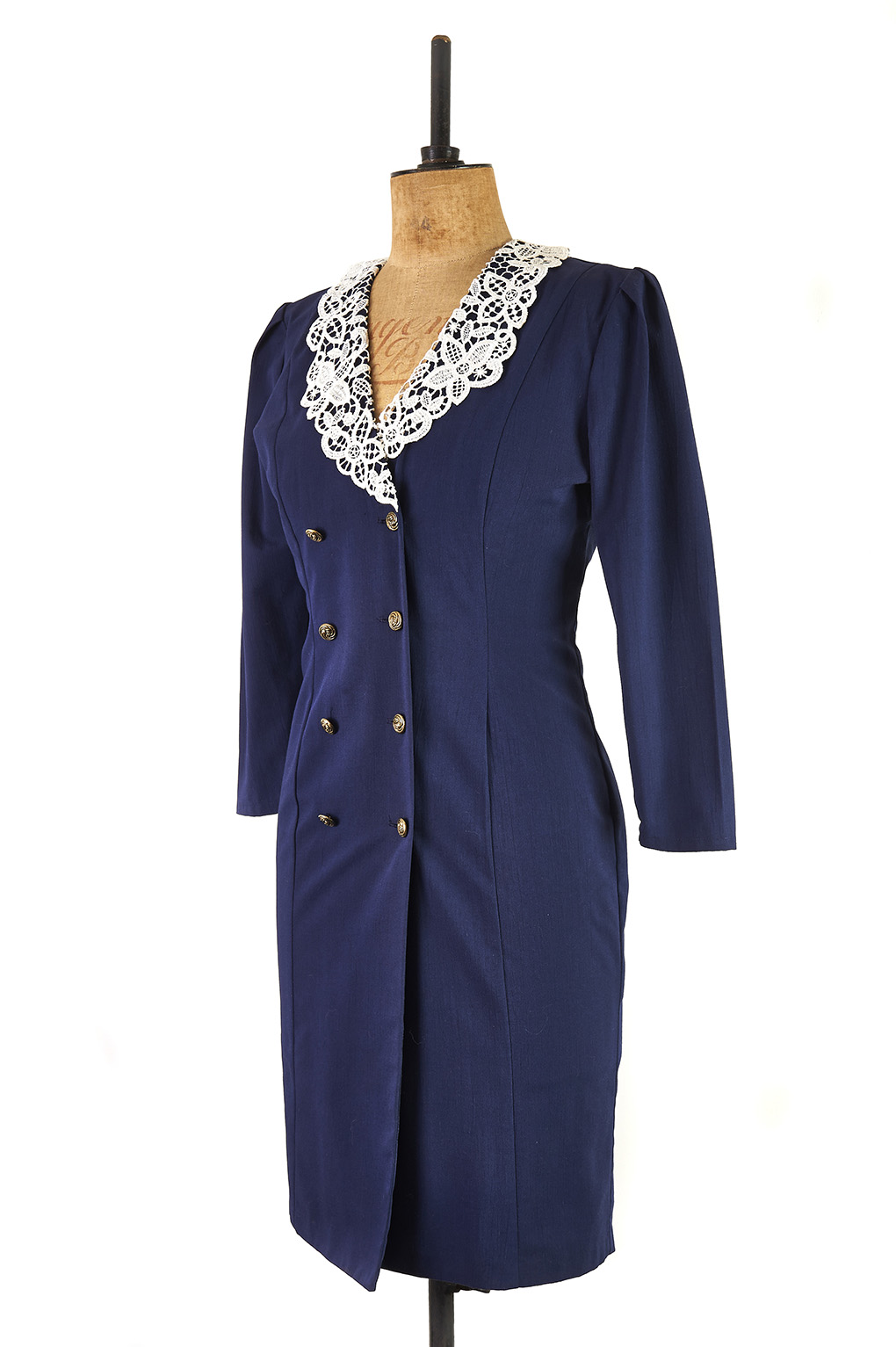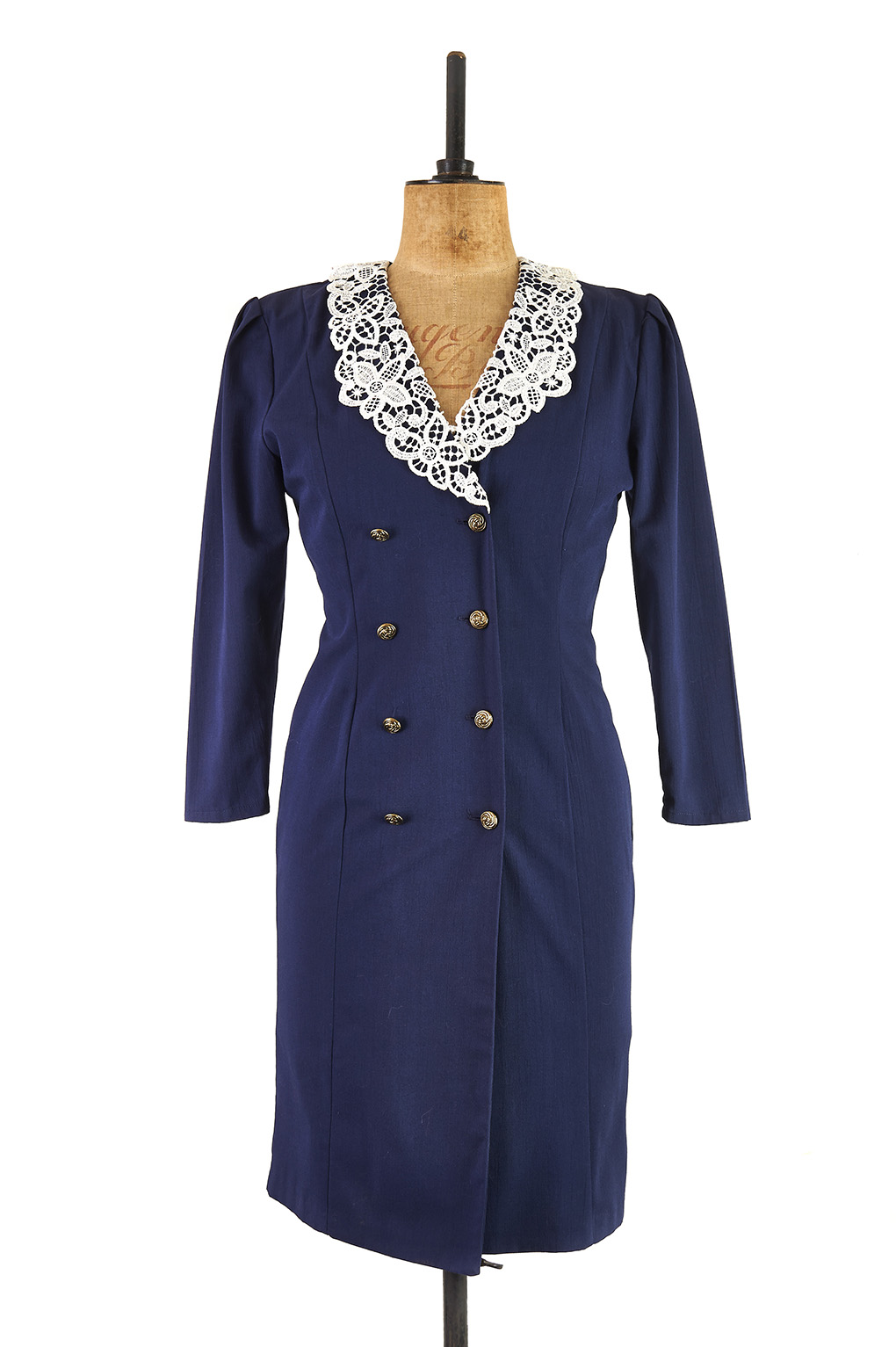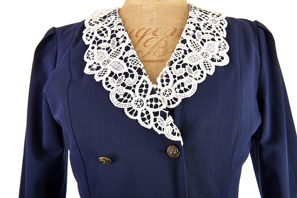 It features a defined waist and an amazingly detailed lace collar.